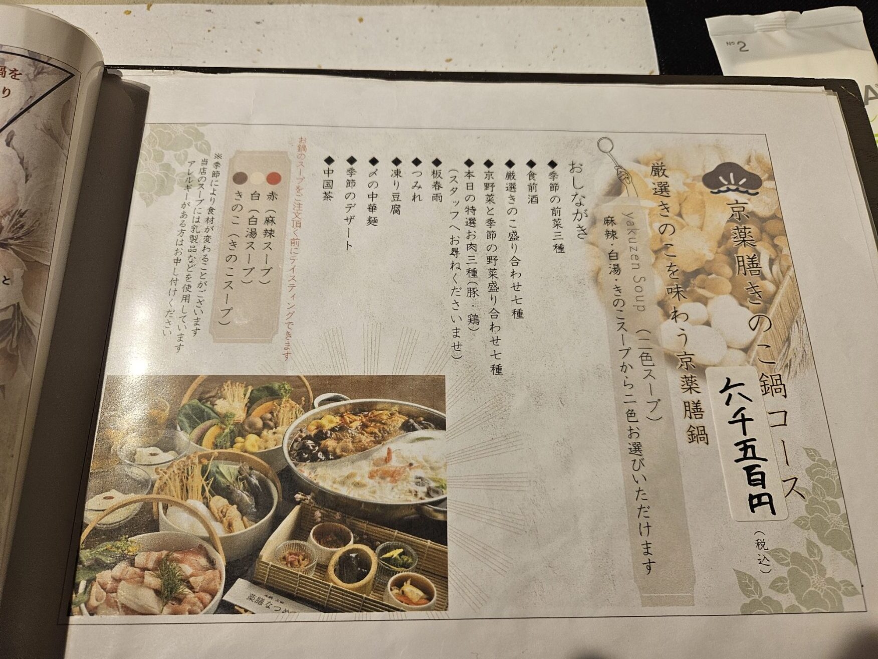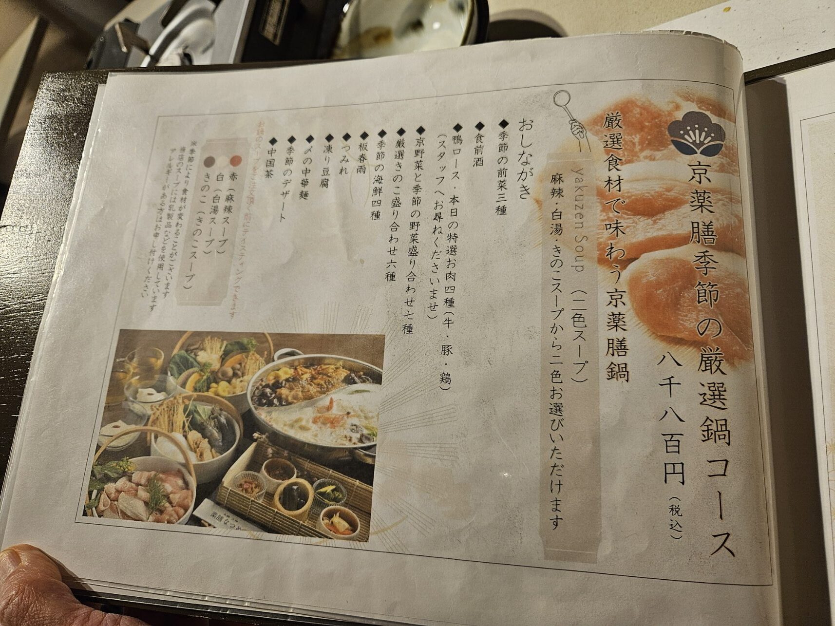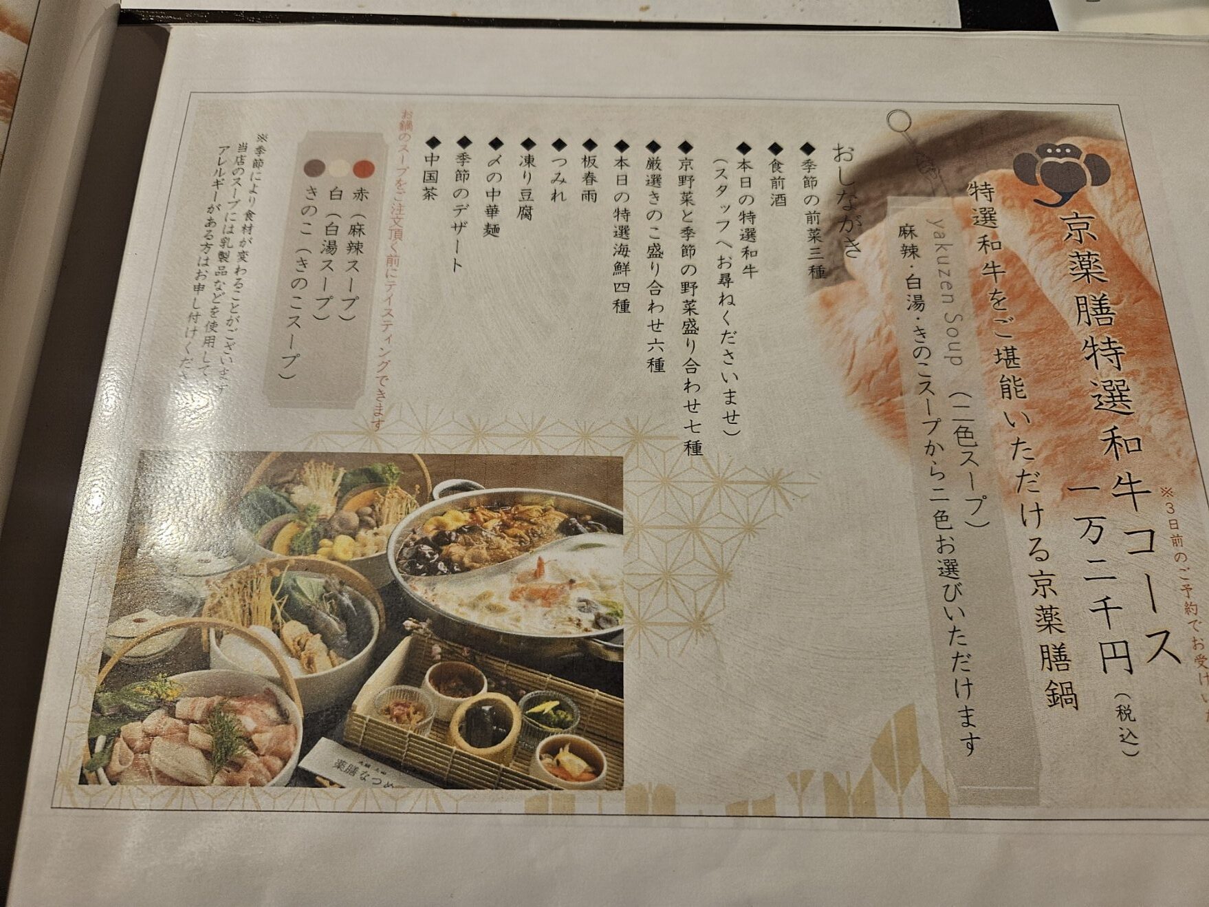 今回注文したのは、京薬膳季節の厳選鍋コース全13品 ¥8.800(税込)