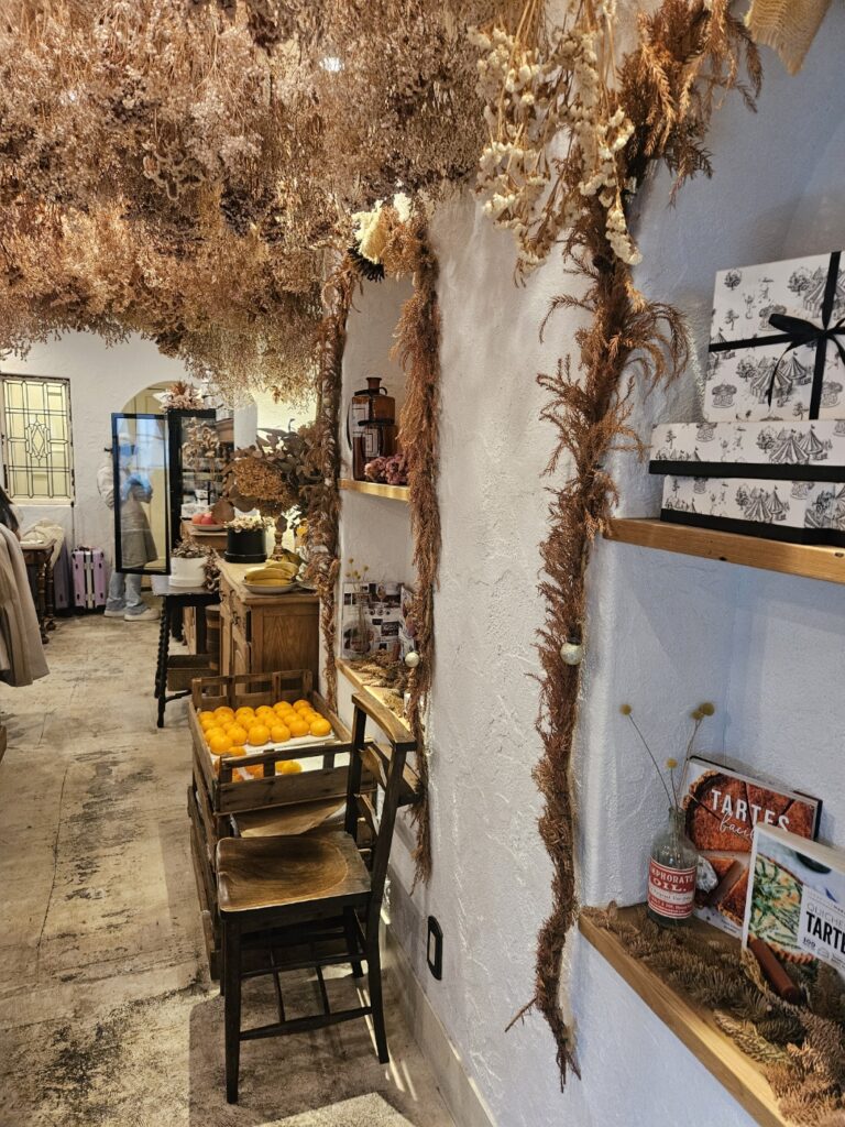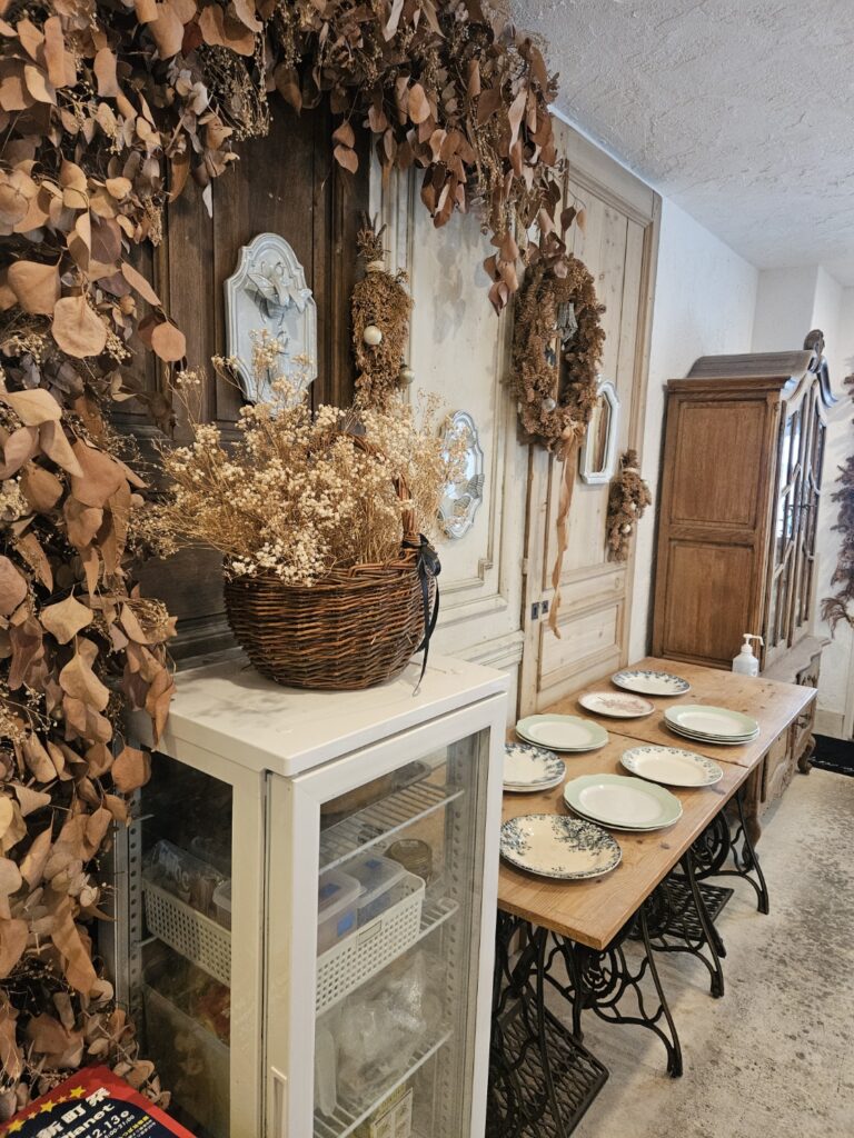 扉を開けた瞬間、まず心を奪われるのは 天井一面に広がるドライフラワー。淡いベージュやくすみカラーで統一された空間は、京都の町家ともヨーロッパのアトリエともつかない、不思議でやさしい空気をまとっています。