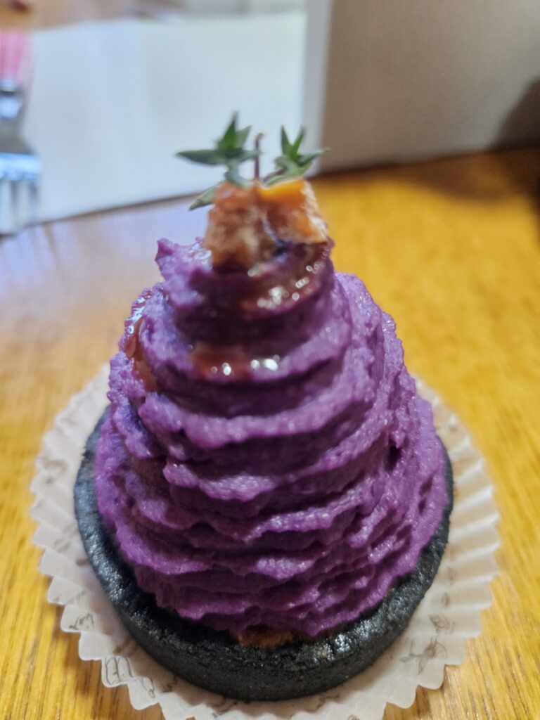 ひと目見た瞬間に印象に残る、美しい紫色のモンブラン状クリーム。紫芋の自然な甘みが前面に出ており、甘さは控えめながらコクはしっかり。