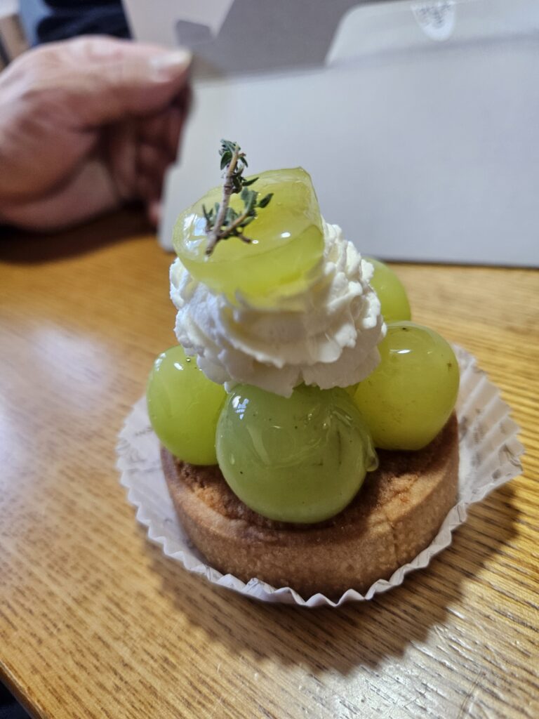 大粒のシャインマスカットが贅沢に使われたタルトは、見た目からして爽やか。口に入れた瞬間、パリッとした皮と溢れる果汁が広がります。