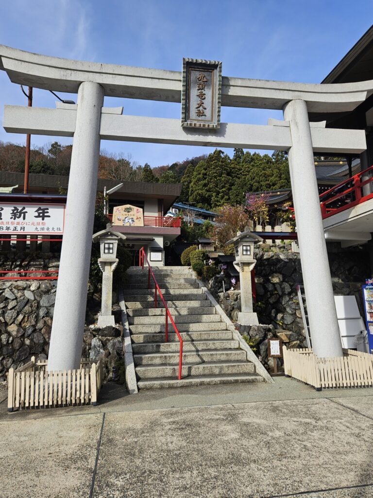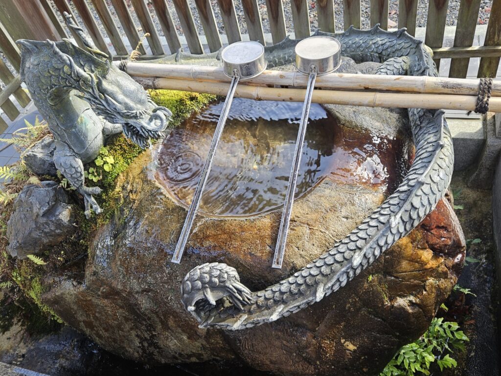 境内で特に印象的なのが、龍が巻き付くように彫刻された手水舎です。大きな自然石の上に九頭竜が表現され、水を湛える姿は非常に象徴的で、写真映えするだけでなく、九頭竜信仰の核心を視覚的に伝えています。