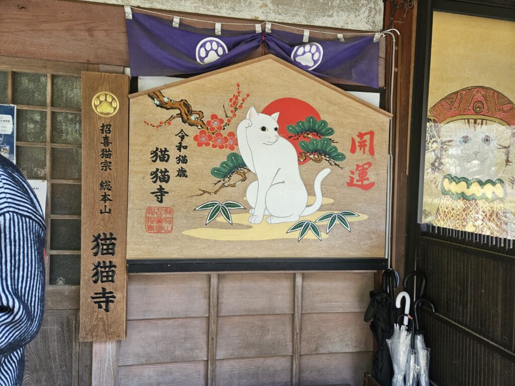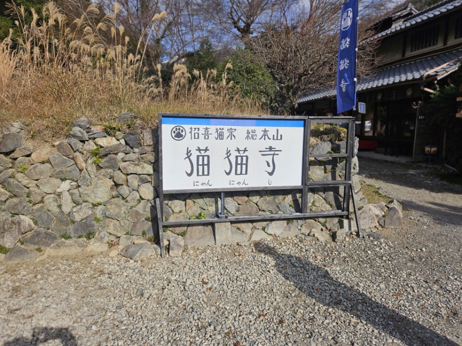 参道入口の看板からしてインパクト抜群。「猫猫寺」の文字と肉球マークに、訪問前からテンションが上がります。