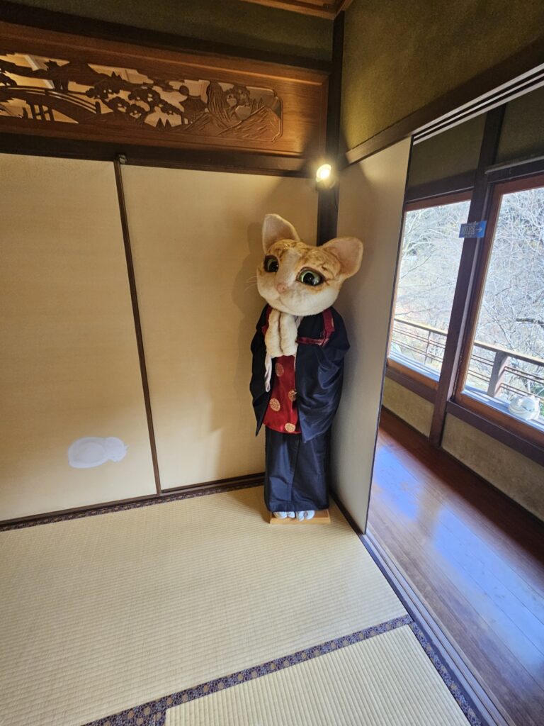 室内の一角には、着物をまとったリアルな猫像が静かに佇んでいます。