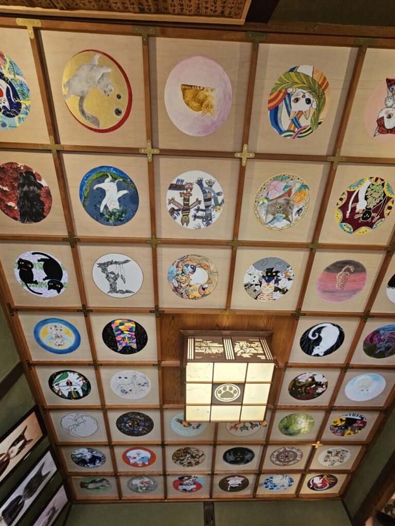 丸い円形作品が格子状に配置され、それぞれ異なる猫の世界観が描かれています。伝統建築と現代猫アートの融合は、